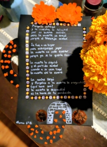 La encomienda fue, además de la escritura, diseñar un cartel original que sirviera como presentación de lo escrito. Alonso presentó su diseño en una cartulina negra con letras blancas, adornos alusivos al día de muertos y flores de papel crepé que él mismo realizó, porque lo que más le gusta es diseñar, crear, pintar, moverse; en fin, divertirse y pensar en que: “La muerte es inevitable”, conclusión a la que llegó después de todo el proceso de pintar su cráneo, ensayar su número musical, escribir una calaverita, diseñar el cartel y presenciar diferentes expresiones artísticas en torno a la muerte.