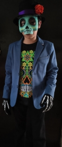 De lo prehispánico pasamos a lo moderno y a un ritmo distinto que sonó a principios de los ochenta y que este año trajeron a valor presente los niños del sexto grado de primaria con su número musical: Thriller (Michael Jackson, 1982) para lo cual Alonso se preparó con antifaz de catrín porque odia el maquillaje, usó sombrero negro de copa adornado con una araña, una flor y listón morado a juego con su saco, porque su esencia es híbrida, resultado de una mezcla entre lo prehispánico con lo mestizo e influenciada por el pop-rock, porque la muerte es así: universal, multicolor, con sonidos y ritmos diversos, con sabor a pan de muerto, chile, mezcal, pulque, dulce de camote, tejocote y mandarina.