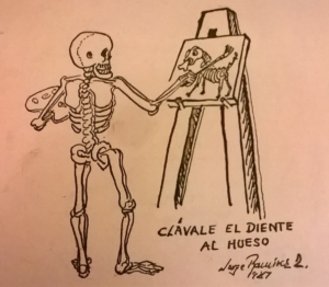 En un lejano año de 1987, un consolidado artista plástico dibujó a la calaca, tilica y flaca para una exposición colectiva a la que llamaron “Clávale el diente al hueso”. Tal artista fue mi tío: Jorge Ramírez (DEP), nombre con el que firmaba en la esquina de cada cuadro. Asistí a aquella exposición de la mano de mi padre (DEP) con mi infantil curiosidad ante los huesos y esqueletos representados en la obra de mi tío y de otros artistas que también presentaron trabajos en cartonería. Poco recuerdo de ese momento, pero me hace ilusión creer que gracias a ellos mi concepción de la muerte es menos tormentosa de lo común.